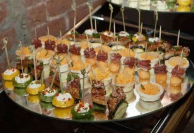 Сделайте разнообразные канапе. Так называют маленькие, на один укус бутерброды. Вместо шпажек можно взять зубочистки и нанизать на них кусочки колбасы, сыра, любых мясных продуктов, копченой и соленой рыбы, корнишонов и оливок. Разумеется, сочетания ингредиентов – на ваше усмотрение. Хлеб вовсе не обязательно должен присутствовать в таких бутербродах.